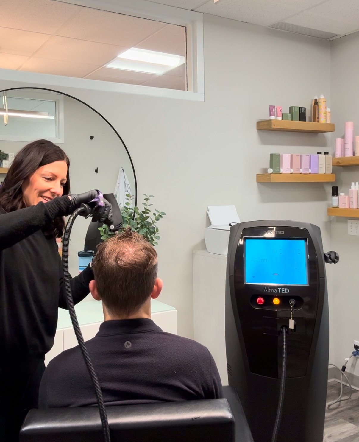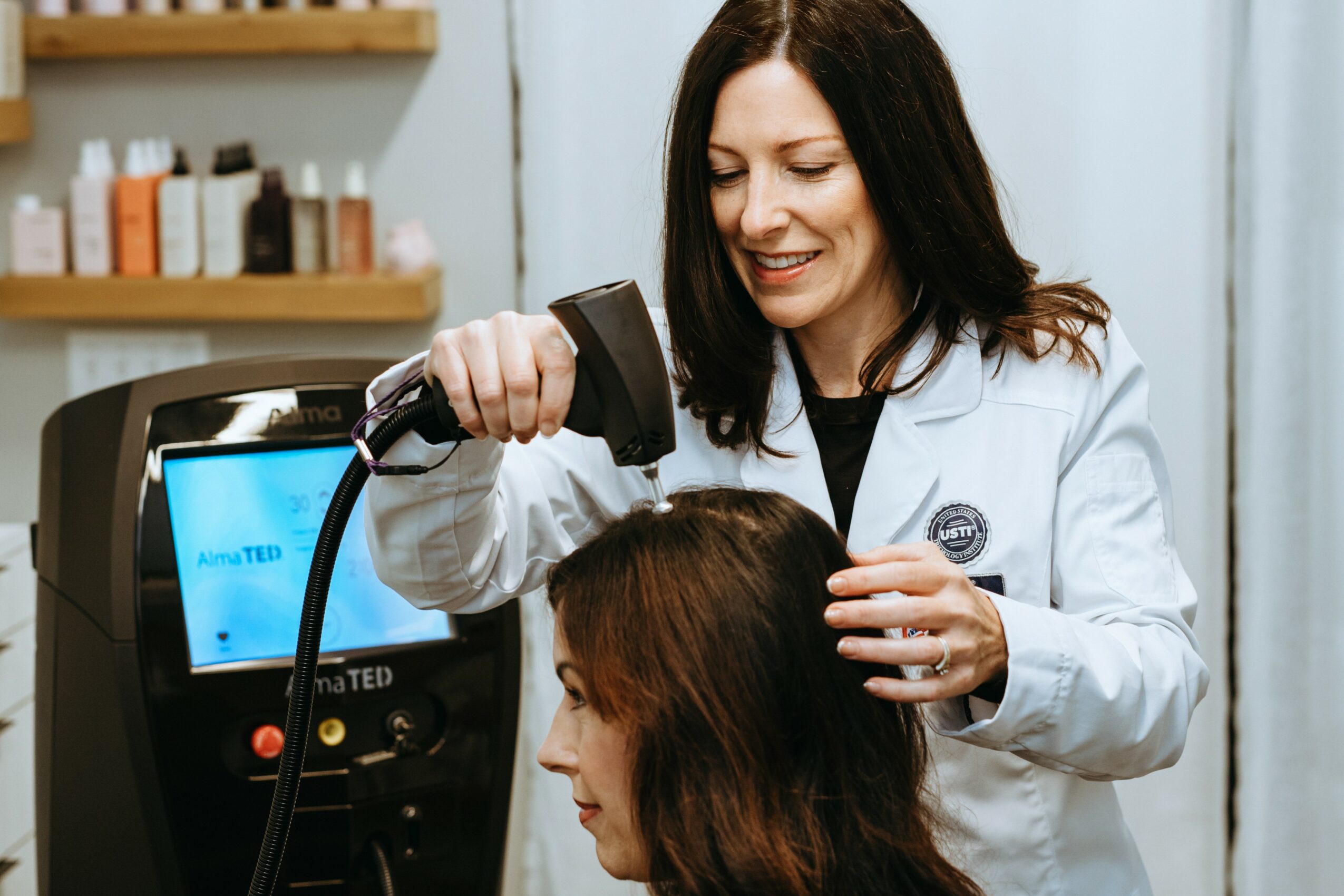 My approach offers a multi-therapeutic approach with solutions such as hair and scalp care regimens, medical-grade low-level laser therapy, oral or topical solutions, scalp microneedling, and the innovative new Alma TED treatment — a needle-free, pain-free solution that uses acoustic sound wave technology for a non-invasive treatment with no downtime that helps to anchor, strengthen, thicken, and grow new hairs.