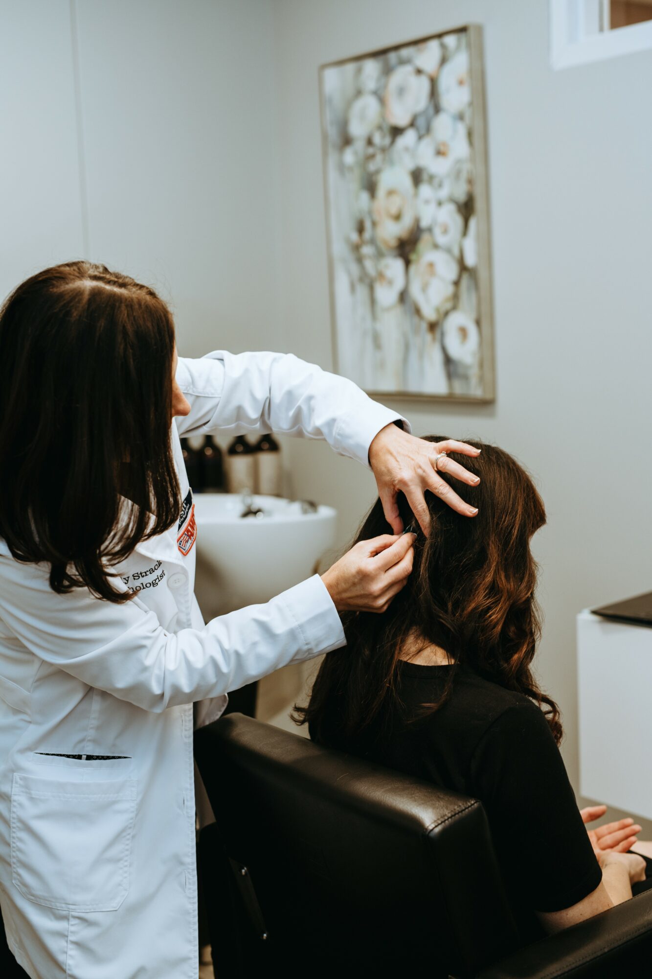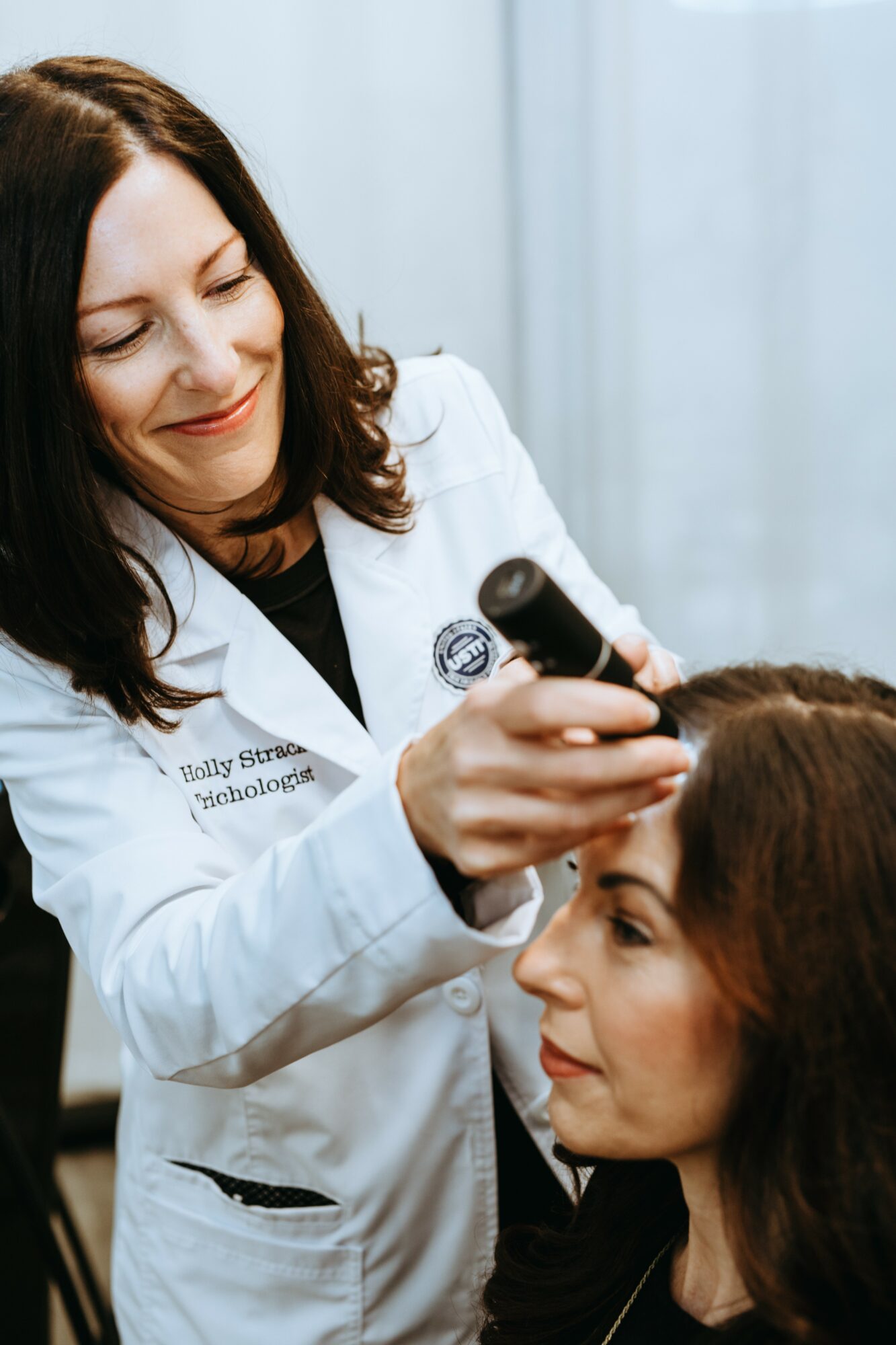 Not only do I provide an in-depth hair and scalp evaluation, I truly listen to each client and their story. Upon booking an appointment, I have clients fill out a digital form that includes questions about their lifestyle, stress, hormones, blood work, health conditions, medications, supplements, weight loss, nutrition, surgeries, illnesses, frequency of washing, hair products, family history, and genetics. These questions help to identify some of the underlying causes of hair loss, hair shedding, and potential scalp disorders. I take digital and microscopic photos of the scalp and hair follicles, which can tell us a lot.