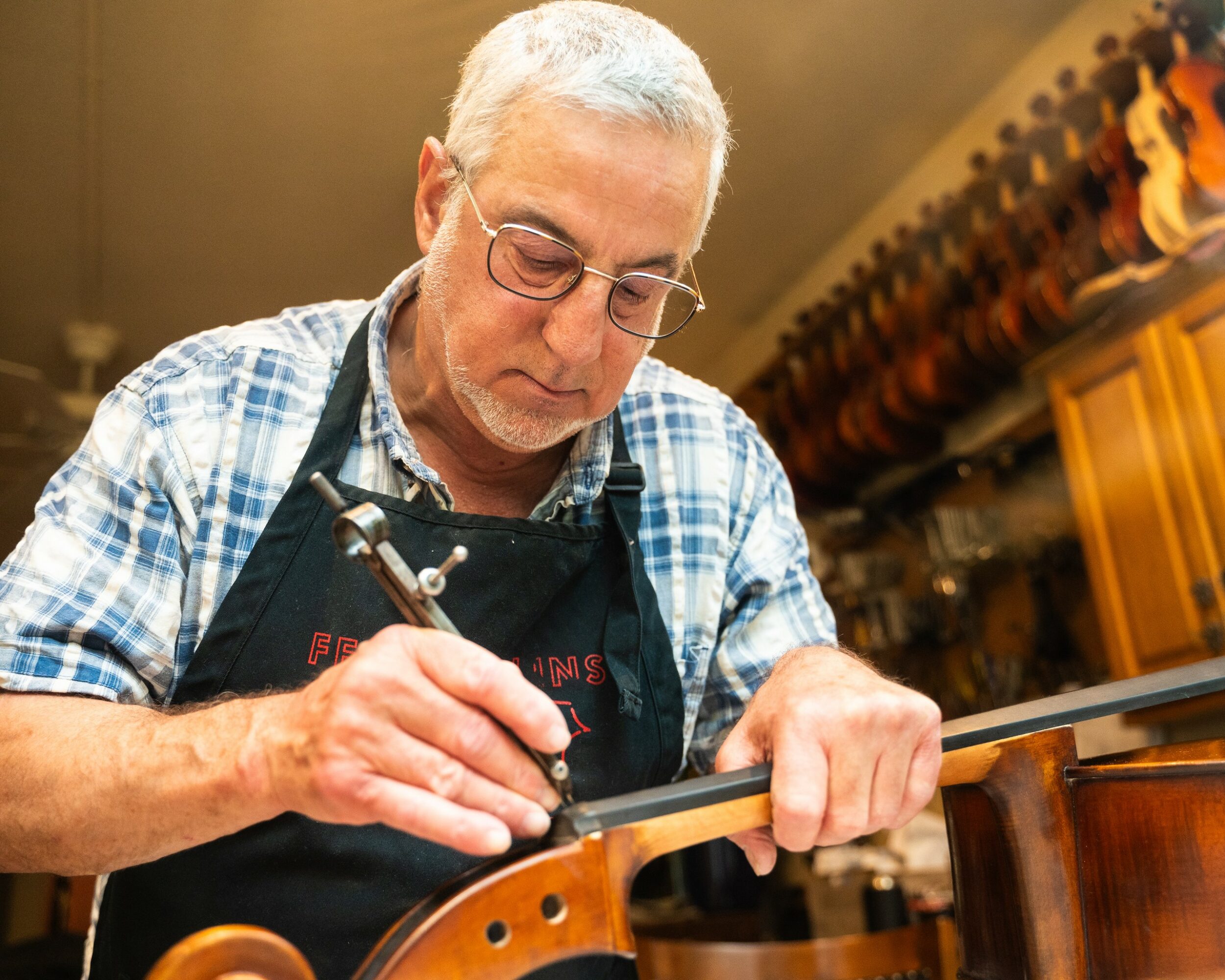 What sets me apart? My willingness to continually evolve and evaluate new techniques use and technology. This is especially true in terms of the set-up of instruments- strings, bridges, tailpieces, pegs, and sound-posts,. The evolution of string technology through my 45 year involvement in the string instrument world is particularly fascinating.