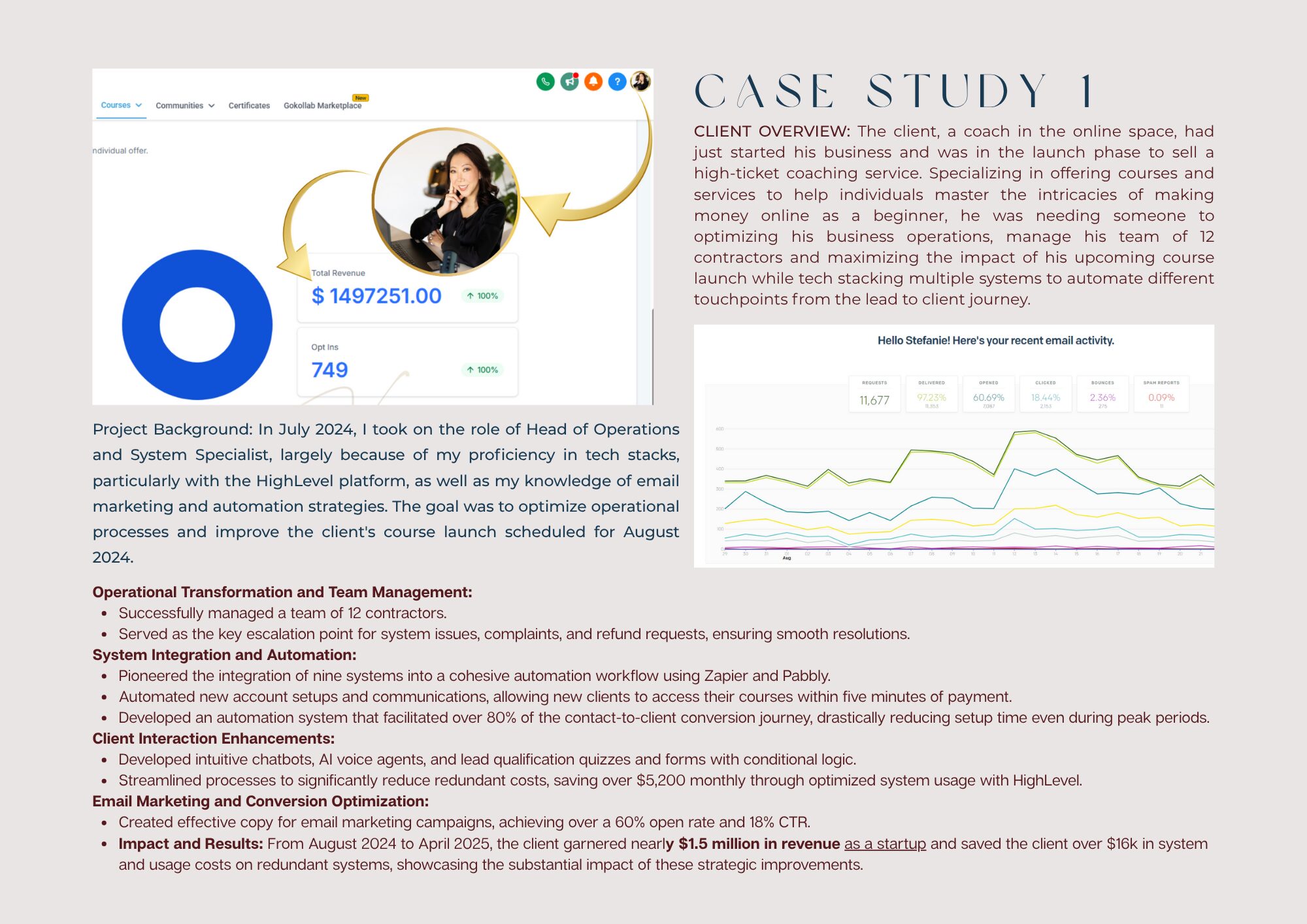 From there, I rebuilt with what I knew best: operations and marketing. I leaned into modern tools and automation, focusing on lead generation and management. A coaching client hired me to automate every touchpoint from lead to sale and generated over $1.5M in nine months from a new program. A local business plugged revenue leaks, lifted consultation bookings 63 percent, and closed $18M that quarter.