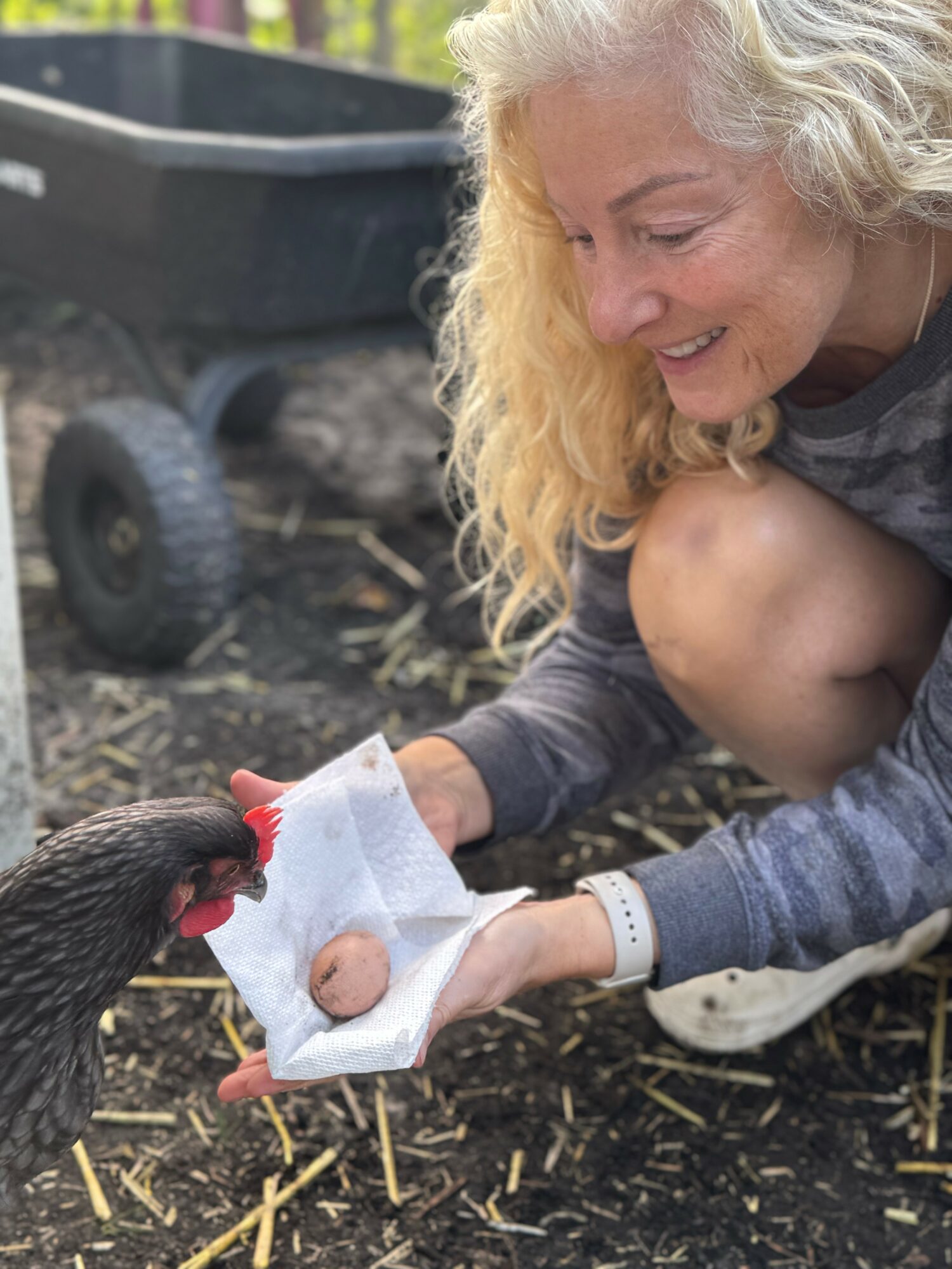 We also have six chickens and three ducks (and I’m madly in love with them all!). They’ve been a huge source of grounding and comfort for me — even though they are SO much work. Because of Mike’s fatigue from radiation and chemo, most of the daily work falls on me, but we have had help from family and friends. And Mike was able to build most of the duck house, before the fatigue got real bad. “The Feathers” as I like to call them bring me peace when life gets overwhelming. And, three of our six chickens are now laying, so there’s the benefit of the perfect food – the egg!