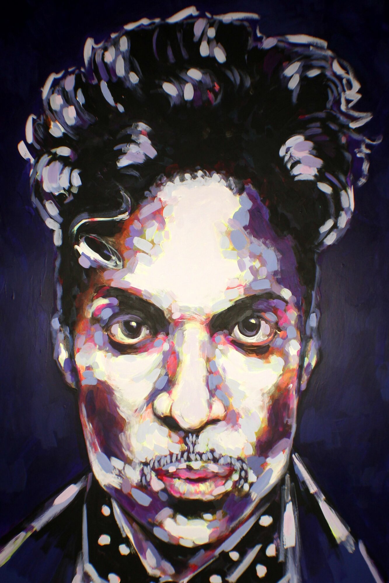 Artist statement: Each person depicted in this portrait is a purposely chosen personality that I find intriguing. Many are creatively divergent from the mainstream. I practice in a very deliberate painterly way in depicting each of these people in a disorderly manner frequently with my fingers. I use watercolor in a non-traditional style that is heavy and plentiful. In between my portraits, I take time to be more playful and less deliberate in my work. I take more risks and use as much color as humanly possible. I have a solid, consistent theme of what it is to be female.